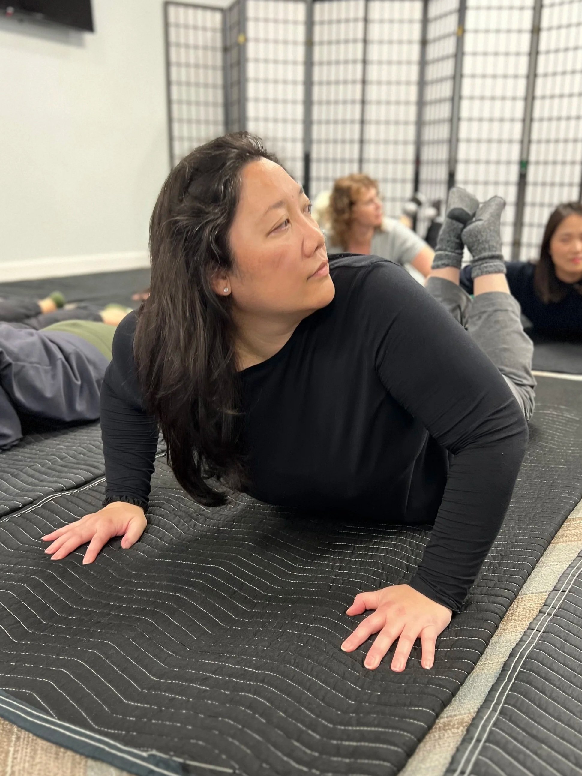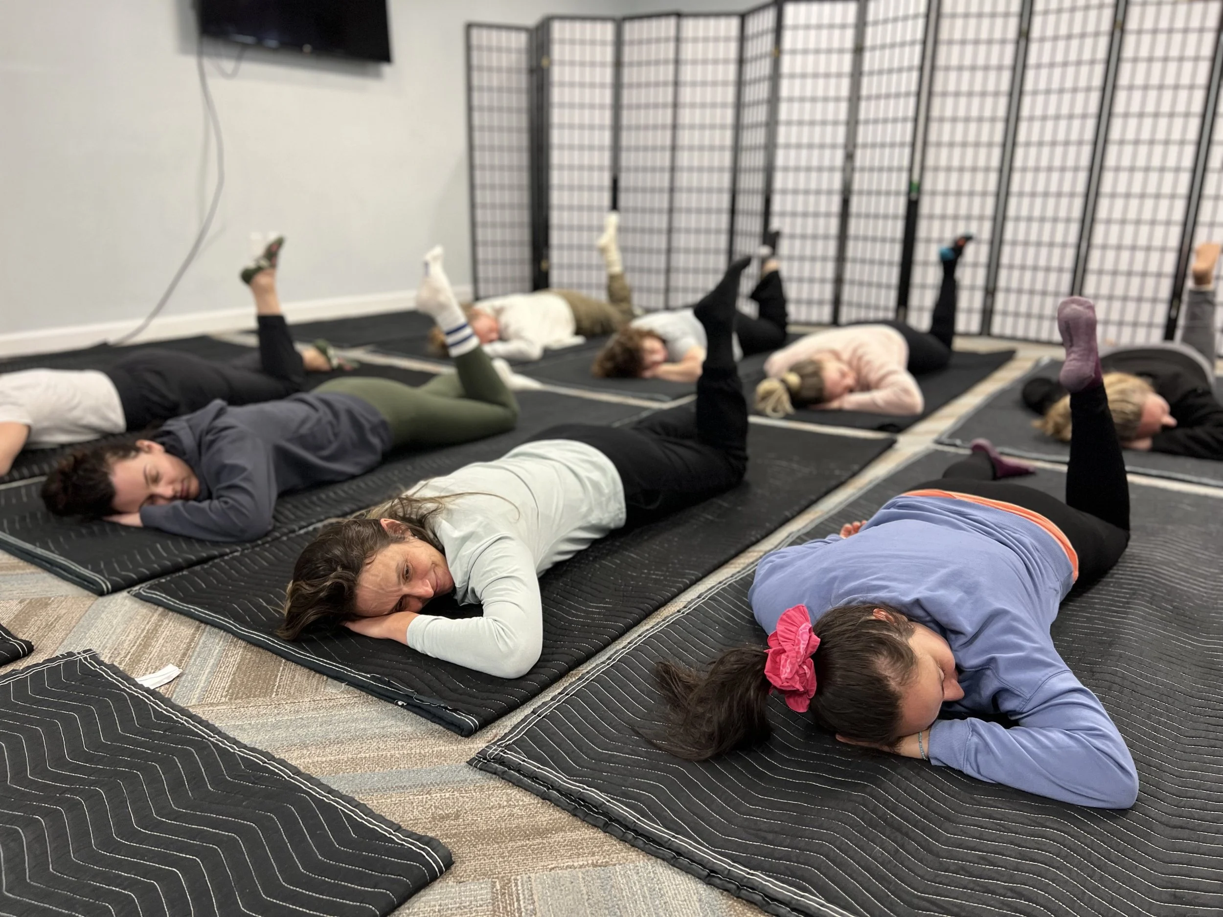 Members lie on mats and follow verbally guided sequences that feel calming in the moment, yet often lead to surprising improvements in posture, flexibility, and ease of movement afterward.